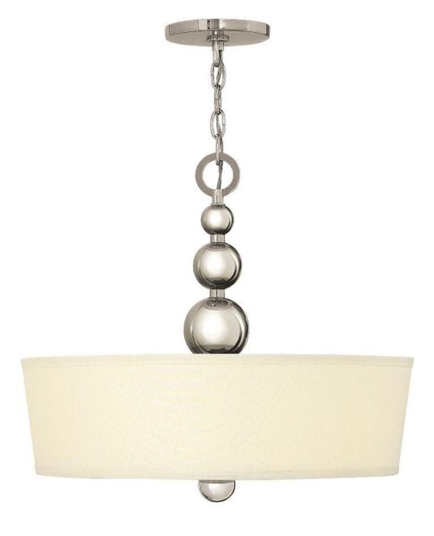HK/ZELDA/P/B PN Polished Nickel Zelda Pendant Chandelier with Shade FEATURES * Polished Nickel finish * Cream Fabric shade * Spheres increasing in size from top to bottom * Adjustable height drop * Chain Suspension * Supplied with 3000mm of chain * 3 Lights SIZE * Diameter 514mm * Height 470mm BULBS * Takes 3 x 60watt E27 (not included) ORDER CODE * HK/ZELDA/P/B PN