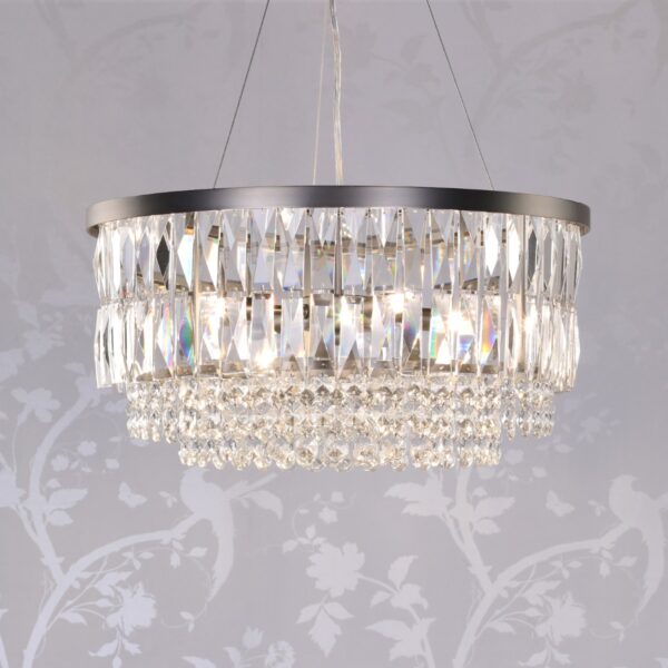 This Laura Ashley Rhosill 4 light ceiling pendant light features stunning faceted glass crystals with an elegant Aged Pewter finish. Crystal glass catches the light beautifully when the light is on or off. The Rhosill is a classic statement light that will compliment any room. FEATURES: * Ceiling pendant light * Crystal glass * Aged Pewter finish * Requires 4 lamps * Dimmable with suitable lamp / dimmer switch * Earthed * Height adjustable at the point of installation SIZE: * Drop: 60-130cm * Diameter:48 cm LAMP: * Requires 4 x G9 LED lamps – NOT INCLUDED