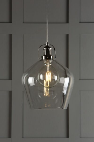 The Laura Ashley Rye is a single ceiling pendant light that fits effortlessly into kitchens and dens. Bold lines and round shapes lend a sophisticated, contemporary touch that looks fantastic against bare brickwork. This contemporary hanging ceiling light boasts industrial appeal with a polished nickel finish and clear glass shade. The fitting has a matching ceiling rose and a clear cable. Height is adjustable at the point of installation. FEATURES * Ceiling pendant light * Polished Nickel finish * Clear glass shade * Takes 1 lamp * Class 2 (double insulated) * Dimmable with suitable lamp / dimmer switch * Height adjustable at the point of installation * This product has a blown glass and as such will all vary slightly and no two glasses are can be identical and some small bubbles are to be expected SIZE: * Drop: 41 – 141cm * Diameter: 30cm BULBS * Requires 1 x 40 watt max Edison Screw GLS (not included) * Ideal for use with LED lamps